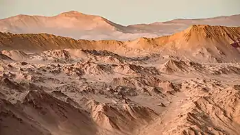 Mojave has alluvial fans that look remarkably similar to landforms in the Mojave Desert in the American southwest. Fans inside and around the outsides of the crater are closely similar to Earth's alluvial fans. As on Earth, the largest rocks are near the mouths of the fans. Because the channels start at ridge tops, it is believed they were formed by heavy downpours. Researchers have suggested that the rain may have been initiated by impacts.[2][3]