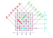 For the projections, the coordinate system is derived from the one of the grid. Indeed, it meets two requirements: 1) The pixel (0,0) is always projected on the point 0 of the projection (this is a consequence of linearity of the Mojette operator) 2) The direction of the projection is fixed "counterclockwise" as in trigonometry when going from 0 ° to 180 °.