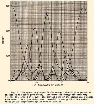 Following the discovery of microscopic particles and the development of computers, interest expanded beyond the proving ground of gravitational systems to the statistical properties of matter. In an attempt to understand the origin of irreversibility, Fermi proposed in 1953, and published in 1955,[3] the use of MANIAC I, also at Los Alamos National Laboratory, to solve the time evolution of the equations of motion for a many-body system subject to several choices of force laws; today, this seminal work is known as the Fermi–Pasta–Ulam–Tsingou problem. The time evolution of the energy from the original work is shown in the figure to the right.