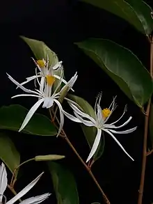 It has inflorescences in few- to many flowered units, sometimes on a common peduncle (stalk), or solitary flowers. They are showy and white. The sepals are narrow with the petals being truncate and glandless. The stamens are numerous, in 2 whorls each of 5 phalanges with basally fused filaments (stamen stalks), the outer whorl is antesepalous and longer than the inner.[5]