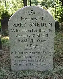 Mollie left Sneden's Landing after the war ended. With her bachelor son, Dennis, she moved to New York City, leaving operation of the ferry to John, "The Patriot." Other sons moved to the British colonies of Nova Scotia and New Brunswick.[2] In about 1788, when she would have been 79, Mollie returned with Dennis to Sneden's Landing and took up residence in a house adjacent to the landing known as the "Mollie Sneden House," 14 Washington Spring Road.[7] She resumed involvement with the ferry and continued to work in this connection until shortly before her death.[1] Mollie Sneden died on January 31, 1810, at the age of 101 years and 18 days,[8] surviving her husband by 66 years.