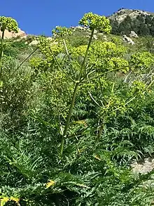 The plant is edible: the young leaves and stems being used in the preparation of liqueurs or eaten fresh in salads in the Eastern Pyrenees.[14] The parts of the plant most commonly eaten are the young petioles (leaf stalks), these being consumed in several different ways: most commonly in salads after being peeled and split into four, the four sections then being soaked in cool water prior to serving. These leaf stalks can also be macerated for a few days in alcohol, along with various other aromatics to make home-made herbal liqueurs of the Ratafia type - based usually, in the case of those prepared in the comarca of Alt Empordà, upon an alcoholic infusion of green walnuts.[17] They were formerly also used in jam-making [recalling both the use of rhubarb petioles to make jam and the candying of Angelica stalks] but this culinary practice appears largely to have died out.[18]