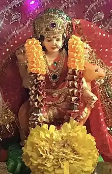 Momai is the highest goddess of the Rabari Tribe. Sorathia group of Rabari called her as a mammai. The village Momai Mora located near Rapar in Kutch is the place where the deity is said to have first appeared, the temple is a place of pilgrimage and huge festival is celebrated here on eve of Navratri every year. She is worshiped as one of the kuldevi of Jadeja, Parmar, Sodha, Jadav and other rulers & worrier clans of erstwhile kutch State and is closely associated with the Goddess Ashapura.[2] She is depicted as mounted on a camel, with four hands. She holds a sword and a trident in the upper right and left hand, respectively and in the lower right and left hands, she has a lotus and armor. [3][1]Apart from jadeja, parmar, Sodha clan, she is worshiped as Kuldevi by Udesh gotra of Rajpurohit community. The Rabari clan of Kutch also worship her. Her image is found in almost every household of Rabaris.[4][5][6] Bardai Brahmins also worship her as kuladevi. Many sub-clans of Mistris of Kutch also worship her as their kuladevi.[7]