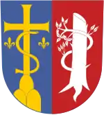 The coat of arms of the monastery is divided into two sections. On the dexter hand side is the symbol of the Celestine monks, an ascetic branch of the Benedictines who were present in Norcia before being suppressed by the Napoleonic laws of 1810, so that the symbol represents the monastery's continuity with the past.