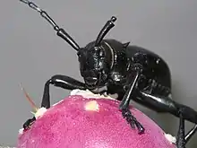 Moneilema gigas is a large, flightless, black beetle native to the Sonoran desert at elevations below 1500 metres.[1] The front wings are fused forming a single, hardened shell. Collectively - with 19 other Moneilema species - M. gigas is also known as the cactus longhorn beetle.
