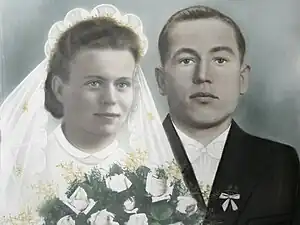 Monidło is a wedding portrait based on a hand-coloured photograph of the bride and bridegroom.