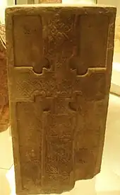 The largest stone is a fragment of a free-standing high cross, 1.16 metres by 0.28 metres wide by 0.18 metres thick, once built into the front of St Regulus' Church and possibly originally from St Bride's Ring.[5] While it features Celtic Christian imagery, it has no idiomatic Pictish symbols, defining it as Class III.[14] The cross is broken at bottom of intersection with the arms. The upper portion of the front face is a crucifixion scene, with the portion of the Christ figure above the waist missing. Flanking his legs are two human figures. Below the crucifixion scene are two robed figures holding unidentifiable objects. Below them are a further two figures holding drinking horns and the bottom of the cross has a seated harpist, similar to that on the Dupplin Cross.