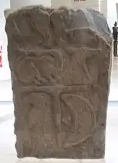 Of the artifacts found in the Church foundations, Jervise made note of two sculptured stones built into the fabric of the church walls.[10] These two stones (now known as Monifieth 1 and Monifieth 2) were removed from the church walls to allow them to be sketched for John Stuart's The Sculptured Stones of Scotland, published in 1856.[11] On a visit to the church by Cosmo Innes, Joseph Robertson and John Stuart in 1864, they were made aware of a fourth stone (Monifieth 3) that had been unearthed in a garden adjoining the church.[12] These four stones were donated to the Museum of Antiquities (now part of the Museum of Scotland) in Edinburgh in 1870.