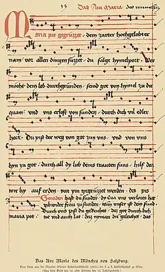 A page of music from the Monk of Salzburg's Ave Maria, from the Mondsee-Wiener Liederhandschrift of the mid-15th century.
