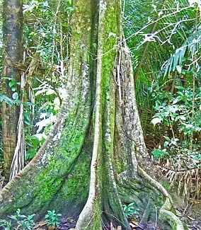 Along the middle and lower reaches, the forest is secondary, betraying the heritage of banana farms and slash-and-burn practises used historically in this area. Today much of this area is protected as the Payne's Creek National Park. Here, relatively dense jungle canopy has returned, resulting in a closed canopy of approximately 15 to 20 metres in height. Yellow bay cedar and other significant sized broadleaf species abound, along with numerous tropical vines and thorny undergrowth flora. A machete is essential for exploration even where there is an established trail. Black howler monkey troops are plentiful, each troop maintaining a home range of 40,000 to 70,000 square metres in this forest.[3]