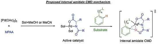 The key intermediate step of these cyclometalation reactions involves the metal-mediated cleavage of the C–H bond and simultaneous formation of the metal–C bond of the substrate. Upon addition of substrate, the N-acyl motif acts as an internal proton acceptor in the concerted metal-deprotonation (CMD) of the transition state for this inner-sphere process. According to this model, the rate and selectivity of the C–H functionalization are impacted by the basicity of the MPAA ligand. The resulting experimental data of steric and electronic alteration of the MPAA ligands align with this model.[12] In 2023, the first experimental observations to support the proposed mechanism were reported, which were previously unattainable due to the lack of well-defined isolated palladium-MPAA complexes.[13]