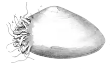 A colony of hydrozoan Monobrachium parasitum on the Macoma calcarea shell.