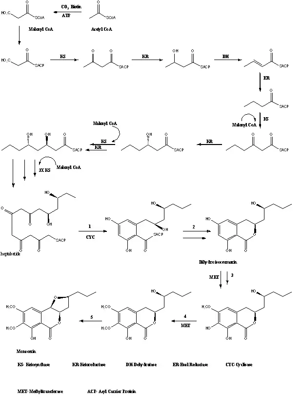 Polyketide synthases (PKSs) of fungi are Type I PKSs. Monocerin has been confirmed by biosynthesis studies to have heptaketide origins. Monocerin PKS produces an intermediate with initially a high degree of reductive modification but ends with a classical β-polyketide moiety. Dihydroisocoumarin is the first PKS-free intermediate which would be formed from the reduced heptaketide whose assembly pathway is shown in figure 1.[2] Ketosynthase, ketoreductase, dehydrates, enol reductases and cyclisases are shown as domains of the Monocerin PKS and methyl transferase is considered to be a tailoring enzyme.[3]