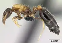 The bicolored trailing ant or flower ant (Monomorium floricola) is a species of ant of the subfamily Myrmicinae. It is a widespread, invasive ant which is found all over the world.[1]