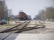 The Monon's main line ran down the middle of streets in several cities, notably Lafayette, New Albany, and Bedford. It also installed an unusual "home grown" warning signal at many grade crossings; these used a green signal light (similar to and adapted from a standard highway traffic signal) that stayed lit at all times, except when a train was approaching. A sign below or to the side of the signal read, "STOP When Signal Is Out" or "DANGER when light is out cross at your own risk".[6] This design was fail-safe, in that when the signal bulb was burned out, approaching vehicle drivers would assume a train was coming — until they eventually realized there was no train and just a burned-out signal.