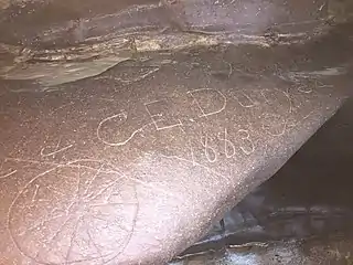 In 1880, Ziebold began a modernization project. He contracted with the Richmond Indiana Steel Company to install metal rollers to replace the water-powered grindstones. Richmond Steel sent Charles Duryea to install the new equipment.[3] Duryea spent at least 2 years in Monroe City, living with the Ziebold family. He visited the Madonnaville Cave where he etched his name and bicycle drawings into a rock shelf.