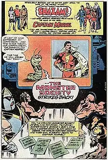 ![]() Mister Mind showing a picture of Captain Marvel to his Monster Society of Evil. On the left from the top: Oggar, Mister Atom and Doctor Sivana. On the right from the top: Ibac, Black Adam, and King Kull. The first page of the 1980–1981 The Monster Society Strikes Back story arc. Art by Don Newton and Dave Hunt, lettering by Todd Klein, colors by Adrienne Roy, from World's Finest #264. | |