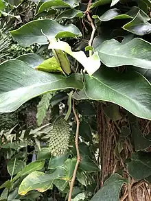 Monstera tuberculata, also called the giant Monstera or the giant velvet-leaf Monstera, is a species of plant in the genus Monstera native from Mexico south to Panama.[1] It grows in lowland wet tropical biomes up to 200 metres (660 ft) in elevation.[2] Similar to Monstera dubia and a few other species in its genus, when young M. tuberculata has a shingle-like growth habit with leaves tightly pressed against the trunks of trees. As it matures, it has short-stemmed, oval leaves that lack the fenestrations of better-known species like Monstera deliciosa. Unusually for an aroid, its fruit hangs like a pendant.[3]