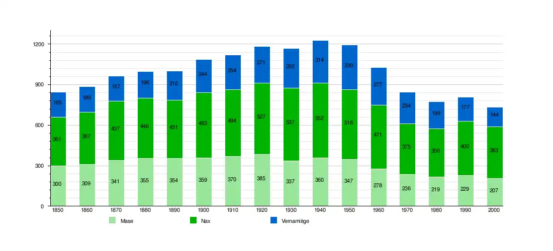 Mase is first mentioned about 1100 as villa Magis. Until 1902 it was known as Mage.[4] Nax is first mentioned around 1001-1100 as Nas.[5] Nax's village church collapsed in 1909 during a service, killing 31 and injuring 50.