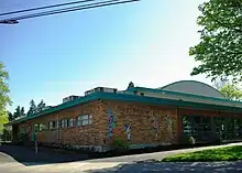 Founded in 2010, the Montavilla Food Co-op is working to bring a cooperative grocery to the neighborhood, though it currently does not have a storefront.[9] Montavilla is home to the community organization Pollinator Parkways, which converts parking strips to wildlife habitat.[10] Montavilla Street Fair is held each summer, bringing community members and local businesses together on the Stark strip. The Montavilla Emergency Warming Shelter[11] and Rahab's Sisters[12] both operate from St. Peter and Paul Church, located on SE 82nd Avenue. The neighborhood was served by the local Mid-County Memo newspaper until 2019. The Montavilla Farmers Market is held on Sundays at 77th and Stark.[13] The southern portion of the neighborhood includes the Jade District commercial and cultural center.