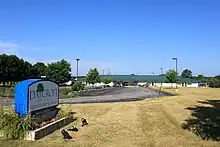 A wide brick building with dormer windows projecting from its roof and a white wooden wing on the left, seen from slightly downhill