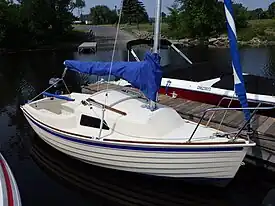 The Montgomery 15 is a recreational keelboat, built predominantly of fiberglass, with simulated lapstrake construction molded in. It has a fractional sloop rig, a nearly plumb stem, a vertical transom, a transom-hung rudder controlled by a tiller and a fixed stub keel with a retractable centerboard. It displaces 750 lb (340 kg) and carries 275 lb (125 kg) of ballast.[1][2]