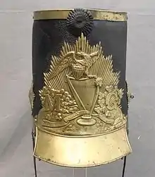The new company was one of several Irish-American militia companies named for Richard Montgomery, an Irish-born general who had served in the Continental Army; others were started in New York, Philadelphia, and New Orleans. Among the organizers of the Boston company was the philanthropist Andrew Carney, who was then a partner in a clothing firm that supplied the U.S. Navy with uniforms.[5] Thus the Montgomery Guards of Boston were provided with custom-designed green uniforms with scarlet facings and gold trim, and caps bearing their own company emblem: an American eagle alighting on an Irish harp.[1] Their motto, borrowed from the Charitable Irish Society, was "Fostered under thy wings, we will die in thy defense."[3]