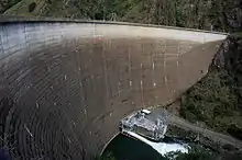 Monticello Dam is a 304-foot (93 m) high concrete arch dam in Napa County, California, United States, constructed between 1953 and 1957. The dam impounded Putah Creek to create Lake Berryessa in the Vaca Mountains.
