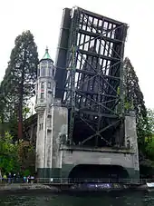 It is the easternmost bridge spanning the canal. The bridge is 344 feet (105 m) long, and was designed by Carl F. Gould, one of the original architects of the University of Washington campus. The bridge and its control towers were designed in conjunction with the university's Collegiate Gothic style. It provides a clearance of 46 feet (14 m)[3] and is reported as providing 48 feet (15 m) of vertical clearance above the mean regulated level of Lake Washington for the central 100 feet (30 m) of the bascule span.[4] It is one of four original bascule-type drawbridges over the Ship Canal, the others being the Ballard, Fremont, and University bridges. It was the last one to be completed, has the highest clearance of the four, and is the only one that is part of the state highway system. It is also one of six bascule bridges based on a design derived from the Chicago bascule bridge, but is unique because of its trunnion supports, employed to avoid a patent infringement lawsuit by the Strauss Bascule Bridge Company.