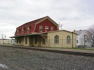 The railway station was built by the Intercolonial Railway in 1881 and enlarged in 1904.[2] The station building features a first storey of brick with arched windows, a second storey of wooden framed construction, and a gambrel roof.
