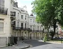 Ten pairs of "delightful" semi-detached villas, five on each side of the road, make up this mid-1840s development by Amon Henry Wilds.[37][116] They are in the Italianate style with influences of Regency architecture, and have two bow windows with bonnet-style canopies above, stuccoed walls with extensive rustication, prominently bracketed eaves and cast iron balconies.[37][116] The "charming" houses are set in spacious plots in a former bluebell wood.[37][65] The street was completed over the course of three years from about 1845.[65] All of the villas are listed buildings.[37]