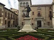 The Monument to Álvaro de Bazán is an instance of public art in Madrid, Spain. Located at the Plaza de la Villa, it consists of a bronze sculpture designed by Mariano Benlliure representing Álvaro de Bazán—a noted 16th century Admiral of the Spanish Navy once described by Cervantes as "father of soldiers, lightning of war, fortunate and never defeated captain"—[1] put on top of a stone pedestal.
