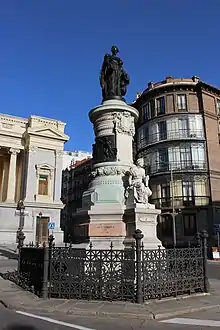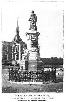 The monument to Maria Christina of Bourbon (Spanish: María Cristina de Borbón) is an instance of public art in Madrid, Spain. Designed by Mariano Benlliure and consisting of a bronze statue of the aforementioned queen consort and regent of Spain and a stone pedestal with additional sculptural elements, the monument lies in front of the Casón del Buen Retiro.