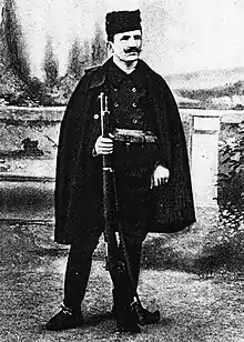 Popović was born in 1881 in Sjenica, Kosovo Vilayet, Ottoman Empire (present-day southwestern Serbia). His family fled from Ottoman rule and settled in Kragujevac, where he attended school. After graduating from the Military Academy in Belgrade in 1903 with the rank of infantry second lieutenant, Vojin Popović chose to join the Chetnik organisation in 1905, and in 1911 joined the secret organization "Unification or Death" (Black Hand). He fought against the Ottomans in Macedonia and Old Serbia between 1905 and 1912 (battles at Čelopek, Кumanovo, Prilep, Bitola, and the bank of the Vardar) and against the Bulgarians on the river Bregalnica in 1913. He won military renown in the First World War battles of the Drina, the Коlubara and particularly for Cer, and was decorated with the Order of the Кarađorđe Star, 4th and 3rd class (officer and commander). He was promoted to the rank of infantry lieutenant colonel of the Serbian Army, and despite his reputation of being a strict and unbendable officer, he was favoured with complete trust. He was remembered above all as the most exemplary Chetnik leader (vojvoda) because of his exceptionally courageous and inspirational military leadership. His units provided security for Crown Prince Aleksandar Karađorđević during the withdrawal across Аlbania which ensued after the heavy losses Serbia suffered in 1915. In the winter of 1916 he commanded the volunteer detachment engaged in battle with Bulgarians over the strategic peak of Mt Nidža, Kajmakčalan, on the Salonika front. He was wounded at Grunište vis in the River Crna area, but continued to pursue the enemy. On 29 November 1916, at the final stage of the battle, he died of a bullet to the heart.[1]