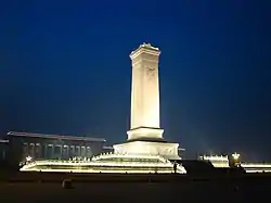The Monument to the People's Heroes (Chinese: 人民英雄纪念碑; pinyin: Rénmín Yīngxióng Jìniànbēi) is a ten-story obelisk that was erected as a national monument of China to the martyrs of revolutionary struggle during the 19th and 20th centuries. It is located in the southern part of Tiananmen Square in Beijing, in front of the Mausoleum of Mao Zedong. The obelisk monument was built in accordance with a resolution of the First Plenary Session of the Chinese People's Political Consultative Conference adopted on November 30, 1949, with construction lasting from August 1952 to May 1958. The architect of the monument was Liang Sicheng, with some elements designed by his wife, Lin Huiyin. The civil engineer, Chen Zhide (陈志德) was also instrumental in realizing the final product.[1]