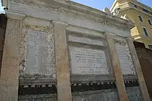 After the breach, a wall was rebuilt with brick and a plaque recalling the event was placed facing outward. Further plaques were added in 1900. On the 25th anniversary of the breach, the City Council of Rome, commissioned from the sculptor Ettore Ferrari, another plaque, recalling the Italian soldiers who had died during the brief attack on the city, and planned for the erection of a tall corinthian memorial column with a bronze winged victory holding a palm leaf atop. The monument was not inaugurated until 20 September 1920, fifty years after the event. Giovanni Battista Giovenale , Giuseppe Guastalla and Adolfo Apolloni completed some of the sculptures. The wall has now four doric pilasters flanking the plaques, with a lower bronze frieze depicting eagle-shields and swords. The marble frieze above shows palm leaves, helmets, and above at the roofline, four antefixes flanked below by lion heads.[1]
