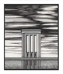 - an empty neoclassical architectural space with symmetrical and blocked plans, closed volumes, gigantism of proportions, exaltation of the overall scenographic vision.