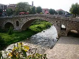 Old Stone Bridge of Prizren was constructed in the beginning of 16th century above the Lumbardhi i Prizrenit river. This is the most well-known bridge not just in Prizren, but also in the whole region.[23] Lumbardhi i Prizrenit divides the city in two parts and is an important attraction point for tourists. It consists of three arches. In the beginning of its construction it used to be 30 m, but today it is only 17 m long.[40] In 1979, because of a flood in the city, the bridge fell apart completely, but it was reconstructed in 1982.[23][40]