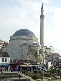 Sinan Pasha Mosque is located in Nenkalaja, on the right side of Lumbardhi i Prizrenit river. It was constructed in the beginning of the 17th century.[36] Its enormous dome is fitted harmoniously into the square mass of the building whereas its interior is painted in strong light colors, decorated with geometrical designs.[23] It is considered to be one of the most important mosques in Kosovo.[36]