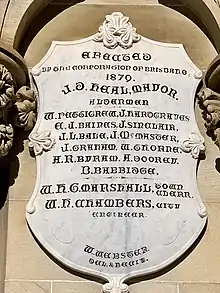 This fountain, erected between 1878 and 1880, was designed by the City Engineer, William Holloway Chambers. It was built at a cost of £627 as part of measures to enhance the visual character of that part of the city. The fountain was funded by the Brisbane Municipal Council and public subscriptions. The fountain incorporated local porphyry (Brisbane tuff), Murphys Creek sandstone, and imported granite and marble. Inscribed on the fountain were the names of the Aldermen in the 1879 Brisbane Town Council, the City Engineer, the Town Clerk, and William Webster, the sculptor.[1]