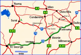 - ↑ "Map of Moonie Highway, QLD". Google Maps.