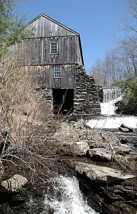 A portion of the land within Moore State Park was once the site of at least five 18th- and 19th-century watermills that were powered by Turkey Hill Brook, which cascades 90 feet over a 400-foot run. The first mills on the site were a gristmill and sawmill built as early as 1747. Visible remnants of the mill village include a triphammer, quarry, schoolhouse and tavern. In the early 20th century, the property became a private estate, large portions of which were subsequently included in the state park.[3]