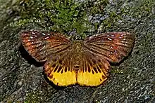 Its upperside is dark brown, and the forewing has a number of white hyaline (glass-like) spots and strokes in the outer half of the wing, while the hindwing has a series of black wedge-shaped discal spots and a yellow tornal area. The underside of the hindwing is predominantly yellowish white.[3]