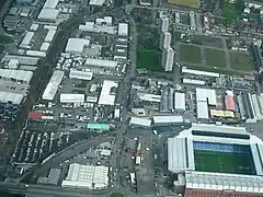 ![]() Aerial view from the south featuring Moorepark (left half of image) in its current industrial form - also showing proximity to Ibrox Stadium | |