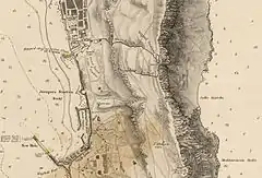 ![]() Detail of an 1831 map of Gibraltar by W.H. Smythe showing the two southern defensive walls: Moorish Wall to the north and Charles V Wall to the south. | |