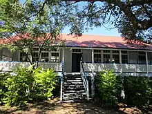 The Sectional School building at Moorooka was aligned approximately east–west, being lowset at the east end, and highset at the west end (due to sloping ground), and consisted of five classrooms 21 by 18 feet (6.4 by 5.5 m), with an 8-foot (2.4 m) northern verandah which wrapped around the east and west sides. A teachers room projected off the northern verandah, and the northeast and northwest verandah corners were enclosed.[20][21] The 1928 plan indicated possible future expansion through the addition of buildings off each corner of the first building, linked by their verandahs;[22] an expansion approach that accommodated the sloping site. The building (known as Block B in 2015) had a Dutch-gabled roof and was set on concrete piers. About two thirds of the understorey play area, on the west side, was floored with concrete. Three of the classrooms were linked by folding partitions, which could be opened to create an assembly hall. The remaining partitions were fixed, with centred doorways.[21] It was reported that there was room for 200 pupils, with ample light and ventilation provided by large windows on the southern side. The completed cost was £2,607.[23][1]