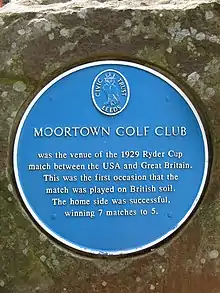 In 1929, Moortown hosted the second Ryder Cup matches, the first to be played in Great Britain.[1] About two thousand spectators saw America gain a narrow lead[2] before the Great Britain team won singles on the final day and thus the competition by a score of 7–5 points.[3]