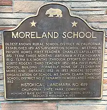 The Moreland School was established in 1851, as California's oldest rural school district in the state. On November 6, 1953, the California State Park Commission, erected a commemorative plaque that designates this site as California Historical Landmark #489. The historical marker is located on Payne Avenue, approximately 100 yards east of Saratoga Avenue, in San Jose, Santa Clara County, California.[1] The first public school building was the former residence of Zechariah Moreland. It was acquired for use as a school on November 13, 1852, through the efforts of the school's third teacher, Samuel Curtis Rogers.[2][3] The Moreland School building stood at the intersection of Payne and Saratoga Avenues. In 1951, the old Moreland School building was dismantled from its original location, making way for the Moreland Apartments.[4] Today, the Moreland School District is a PreK-8 public school district headquartered in San Jose.[2]