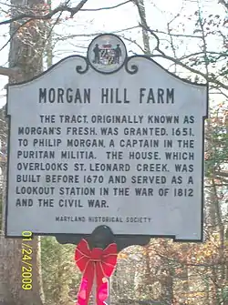 Morgan Hill Farm, also known as Morgan's Fresh or Hill Farm, is a historic home located at Lusby, Calvert County, Maryland. It is a 1+12-story gable-roofed frame house of a T-shaped plan, with single exterior chimneys on each of the three exposed ends. The original building appears to have been built about 1700, with extensively remodeled in the early 19th century. In 1952 a large rear wing was added to the house. Outbuildings include a one-story log servants' quarter, a log smokehouse, and a large tobacco barn.