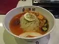 The naengmyeon from Hamhung can be separated into two types: bibim naengmyeon (Korean: 비빔 냉면; "mix cold noodles"), served without broth but mixed with chili paste, and mul naengmyeon (Korean: 물냉면; "water cold noodles"), served in a clear broth that typically combines beef broth with dongchimi (radish water kimchi).[19][20][21] While the broth is different, the strength of Morioka cold noodles is close to that of Hamhung cold noodles but are thicker noodles.